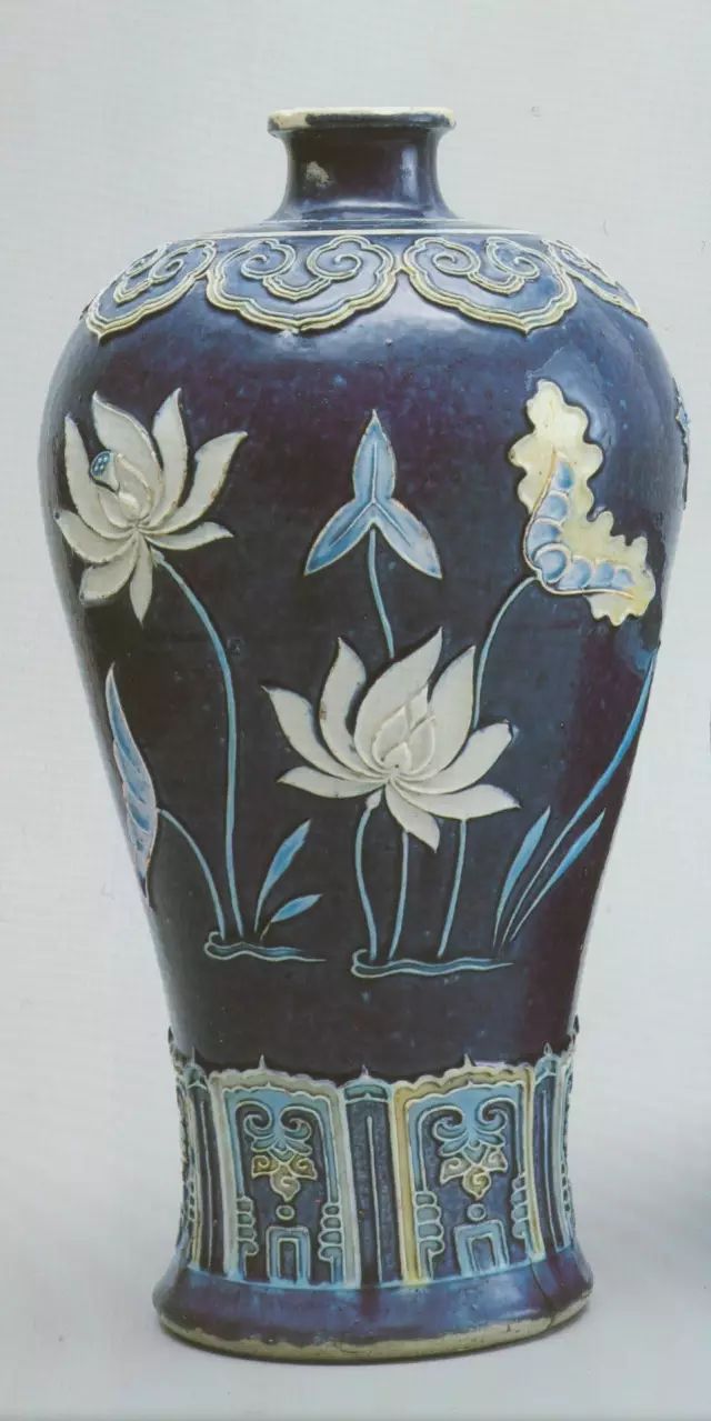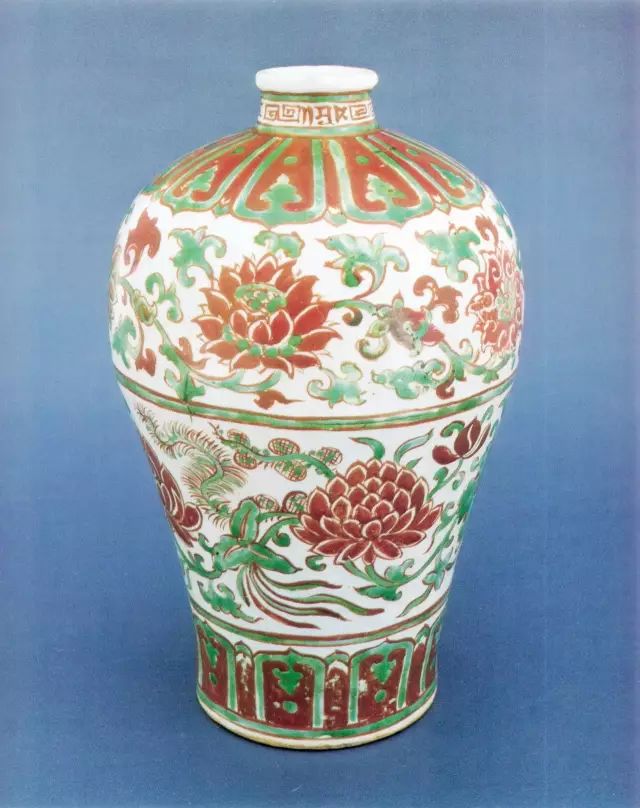 后来,梅瓶向短肥方向转变,重心变低,胫部变粗,逐渐脱离了瓶座,足部装饰的莲花瓣开始稳定,并开始出现变形,元明清历代均很流行。