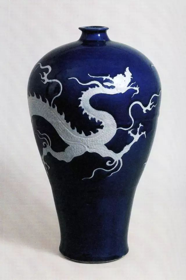 元代晚期景德镇窑霁蓝釉浅刻白龙纹梅瓶,高43.5厘米,扬州博物馆藏