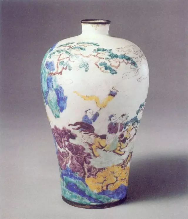 清代初期铜胎画珐琅山水仙人图梅瓶,高21.8厘米,北京故宫博物院藏