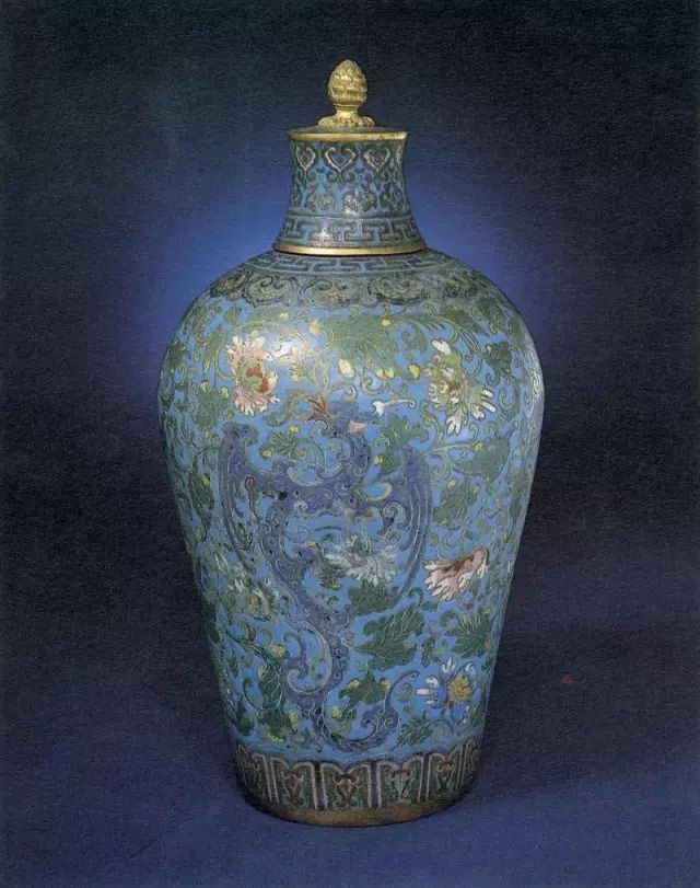 明中期景德镇窑珐华釉青地浅彩莲塘纹梅瓶,高36.8厘米,美国纽约大都会艺术博物馆藏