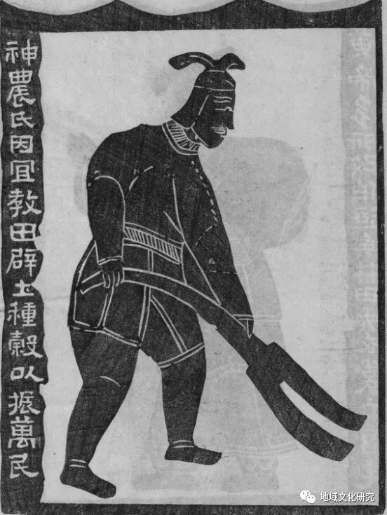 东汉晚期的武梁祠位于山东嘉祥县武氏墓地,武氏家族为东汉的豪强,武梁祠西壁第一层刻有十一位古帝王画像,从右至左,前三位为“三皇”,即伏羲女娲、祝融和神农,其中神农头戴进贤冠,左侧的榜题为“神农氏因宜教田,辟土种谷,以振万民”(图一、图二)。