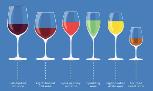 从左到右酒杯容量各不相同,依次为:丰满型红酒杯、轻盈型红酒杯、桃红酒杯、香槟或起泡酒酒杯、轻盈型白葡萄酒杯、加强甜酒杯