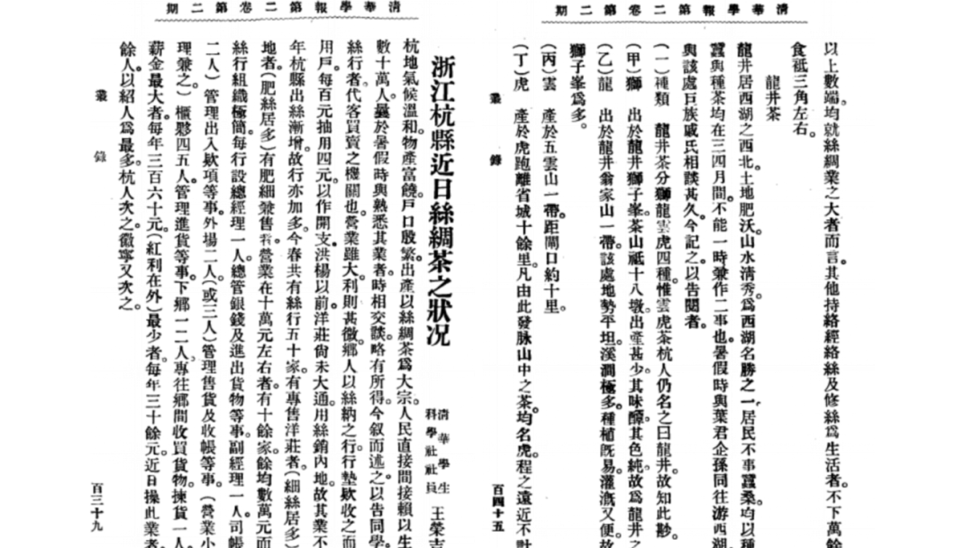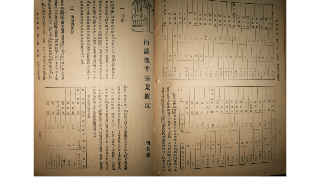 1935年何伯雄在《西湖龙井茶业概况》一文中对龙井茶“狮”“龙”“云”“虎”四个字号产区的49个产地进行了统计,当时面积已达到198公顷,总产量59.4吨。