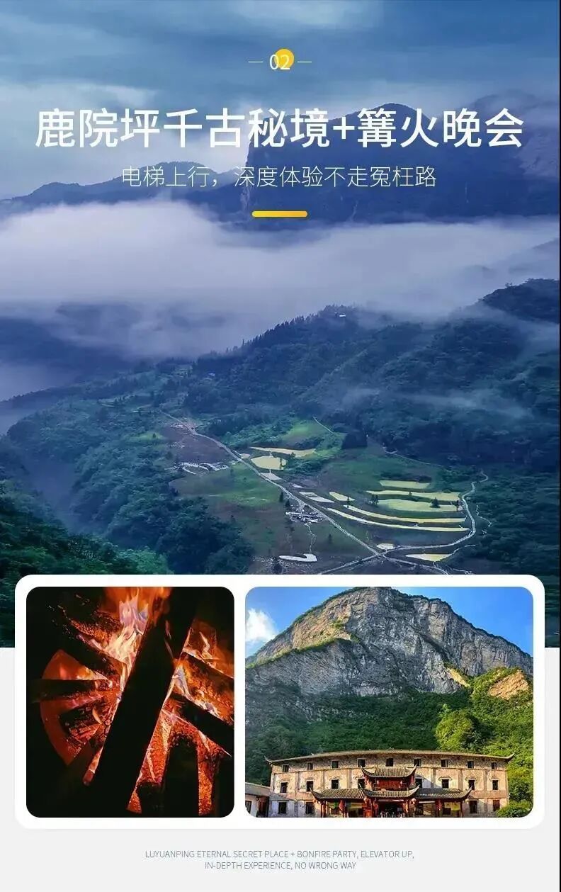 08:15 集合,请主动找领队签到(领车标、对讲机)08:30 准时出发(领队介绍路线、行程安排、注意事项,组织大家相互认识)12:00 途中集体中餐13:00 前往恩施板桥镇【鹿院坪】景区,目前为止唯一一个不通公路的村落,感受原始自然的美!14:30 抵达景区,整理行李,徒步进入前往,走悬崖栈道,鸟瞰鹿院坪美景(约1小时)15:30 抵达客栈分房,徒步游玩18:00 集体晚餐,当地农家菜19:00 一起参加篝火晚会,K歌,看繁星点点D2:鹿院坪-恩施 含:早中餐