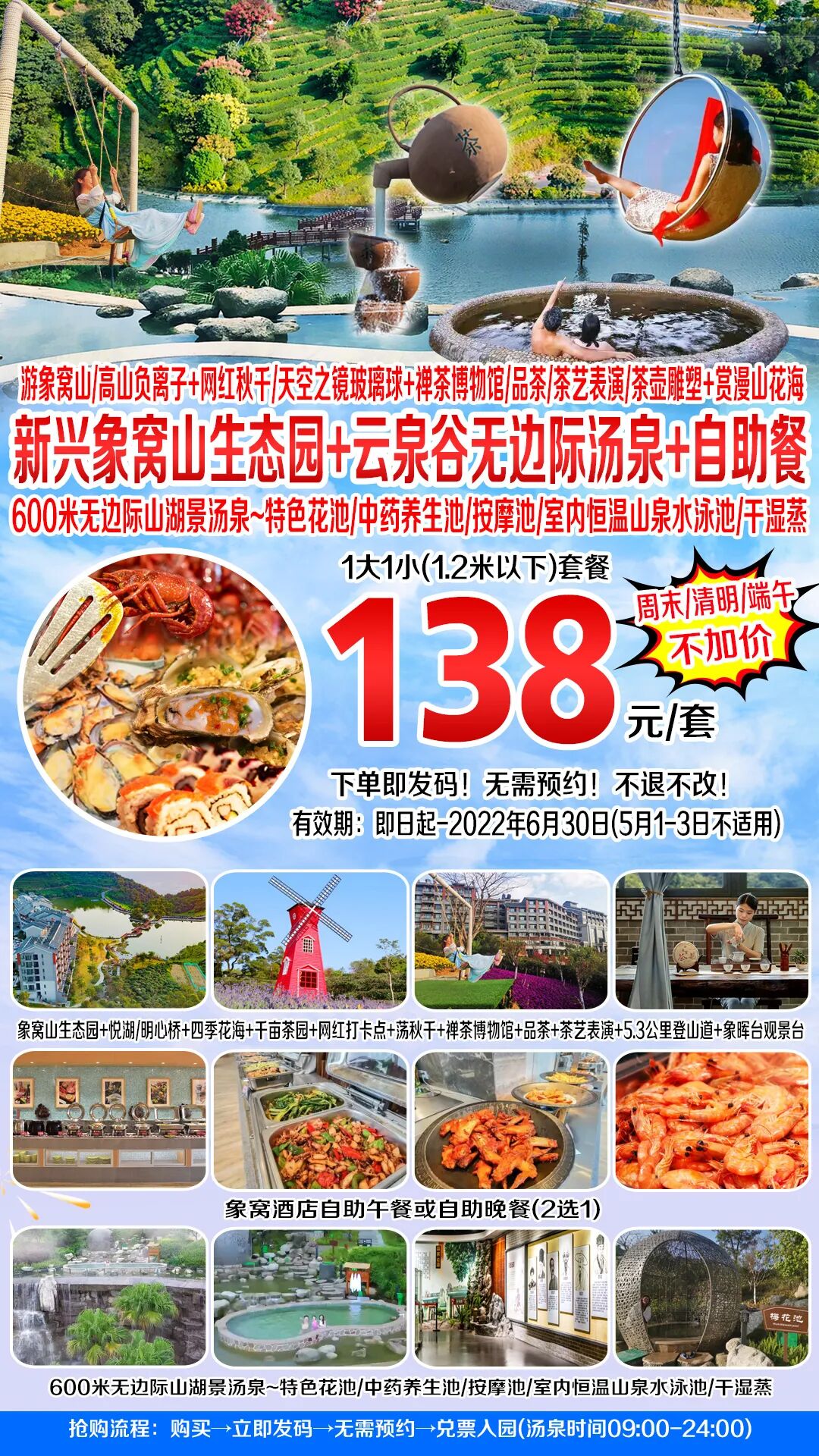 【周末端午不加价】138元抢购!新兴象窝山生态园1大1小套票~云泉谷汤泉+自助午晚餐+四季花海+千亩茶园+禅茶博物馆!