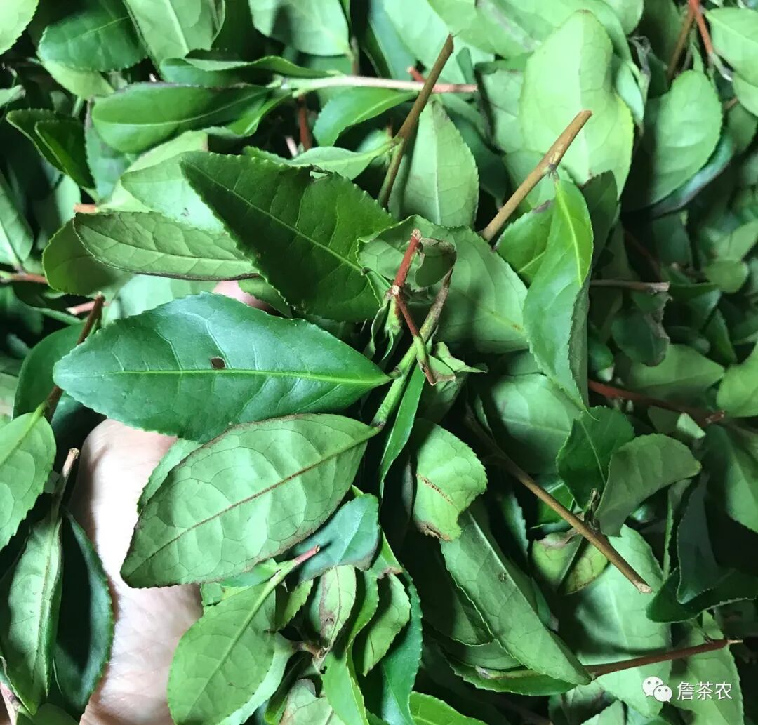 鲜叶中开面,成熟度适中,这样更好摇青。手工采摘使叶芽更均匀,摇青更好控制。