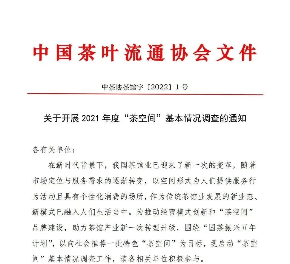 在新时代背景下,我国茶馆业已迎来了新一次的变革,随着市场定位与服务需求的逐渐转变,以空间形式为人们提供服务行为活动且具有个性化消费的场所,作为传统茶馆业发展的新业态、新模式已融入人们生活当中。为推动经营模式创新和“茶空间”品牌建设,助力茶馆产业新一次转型升级,围绕“国茶振兴五年计划”,以向社会推荐一批特色“茶空间”为目标,根据中国茶叶流通协会《关于开展2021年度“茶空间”基本情况调查的通知》(中茶协茶馆字〔2022〕1号)要求,现启动我省“茶空间”基本情况调查工作,请各相关单位积极参与。