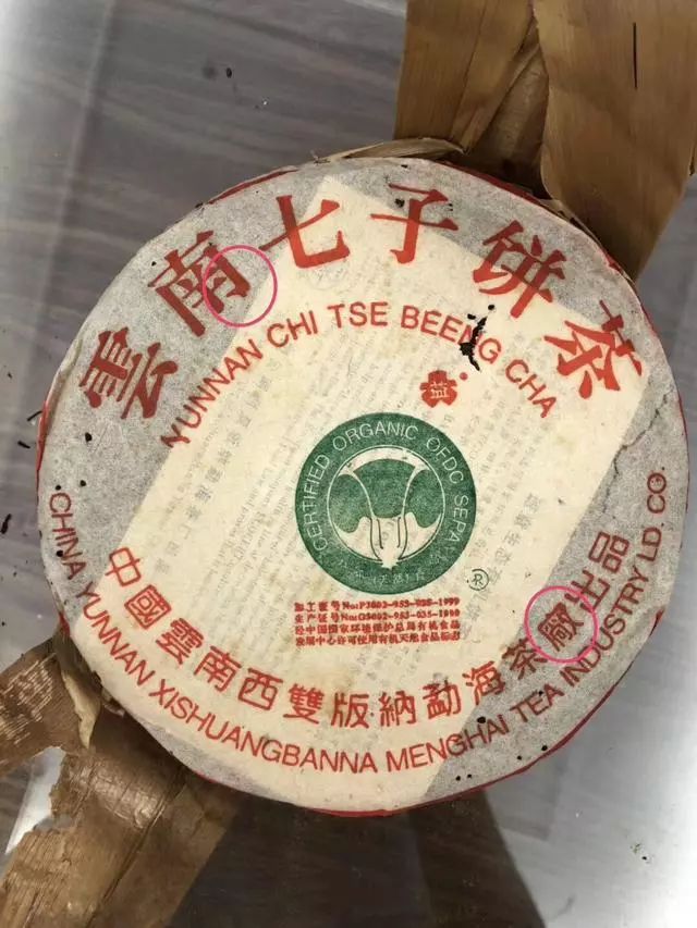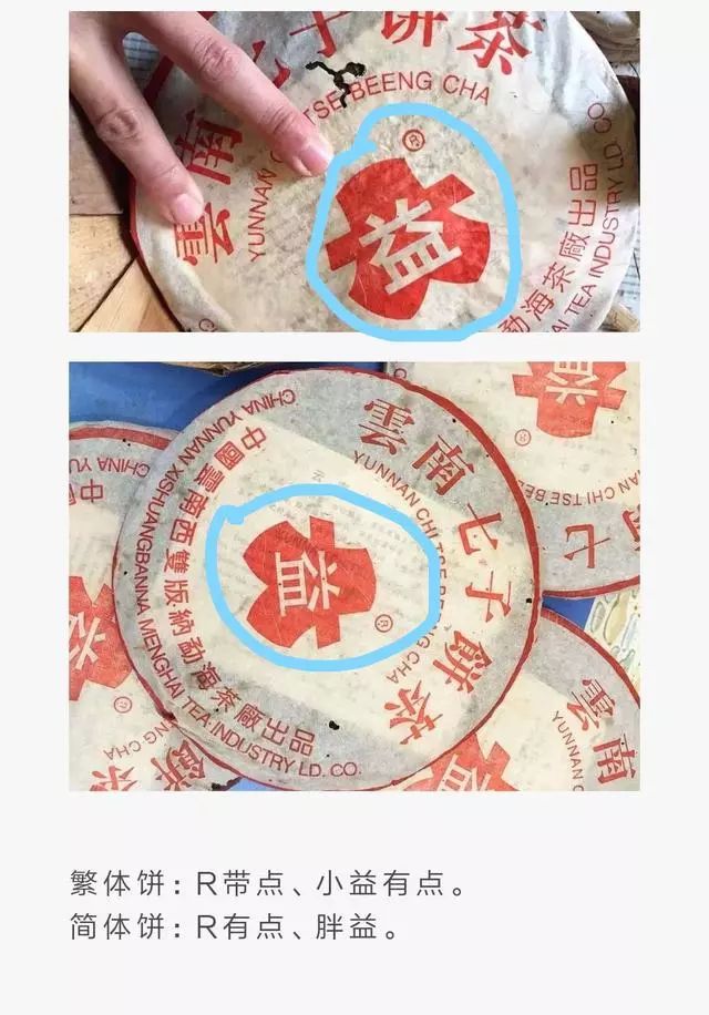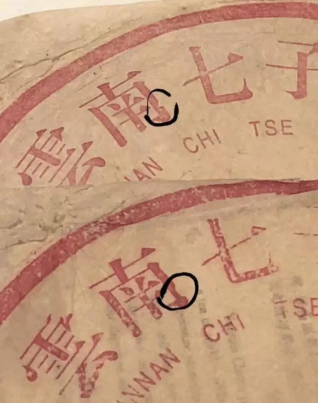 二、外包装纸字体印刷方面:繁体“中國土產畜產進出口公司雲南省茶葉分公司”的“中”字,在70/80年代,大口“中”比小口“中”出厂时间早;在八十年代,云南省的繁体“雲”字,“雨”字头的横析勾连到第二点的比连到第一点的出厂时间更早(如1980年出品的7532<两点>;1985年出品的7542<一点>);在90年代,“云南七子饼”的“七”字,窄脚的比宽脚的出厂时间早(93年前为窄脚七,93后宽脚七)。