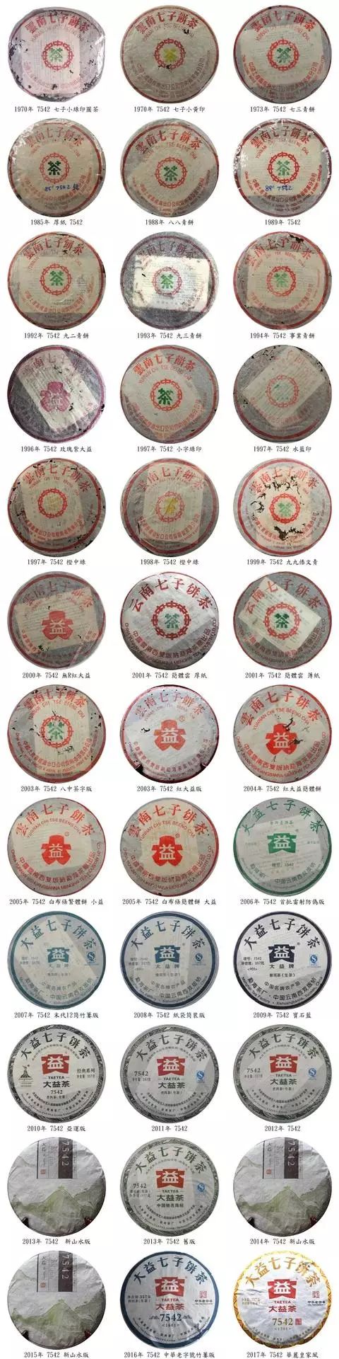 从上世纪1976年到2017年,40多年来勐海茶厂7542最具代表性的明星茶: