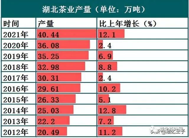 这七大区域公用品牌,也代表了湖北茶叶生产的主要区域和分布,包括鄂东大别山优质绿茶产业带,鄂西武陵山及宜昌富硒绿茶、宜红茶产业带,鄂西北秦巴山名优绿茶产业带,鄂南幕阜山名优早茶及边销茶产业带。湖北近十年的茶叶产量增长及全国比重2021年湖北茶叶总产量40.44万吨,比上年增长12.1%。湖北茶叶近10年的产量翻了近一倍,年均增长率为7.9%左右。根据2022年1月17日,国家统计局官网发布数据,全国茶叶产量量同比增长了2%,根据2020年的产量297万吨推算,2021年全国茶叶产量应该为302.94万吨,首次突破茶叶产量300万吨大关。