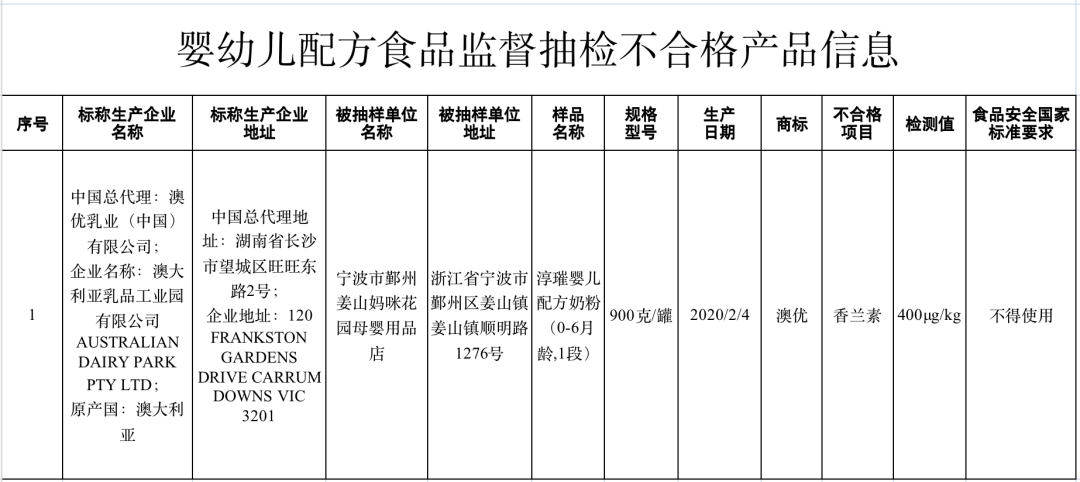 (一)浙江省宁波市鄞州姜山妈咪花园母婴用品店销售的、标称湖南省长沙市澳优乳业(中国)有限公司总代理的、澳大利亚乳品工业园有限公司AUSTRALIAN DAIRY PARK PTY LTD生产的淳璀婴儿配方奶粉(0—6月龄1段,原产国:澳大利亚),其中香兰素检测值不符合食品安全国家标准规定。湖南省长沙市澳优乳业(中国)有限公司对检验结果提出异议,并申请复检;经复检后,维持初检结论。长沙市望城区市场监管局已督促澳优乳业(中国)有限公司立即召回并封存不合格食品6726罐,没收违法所得2.03万元,罚款962.13万元。宁波市鄞州区市场监管局对销售不合格产品的宁波市鄞州姜山妈咪花园母婴用品店,没收违法所得和罚款共1.15万元。