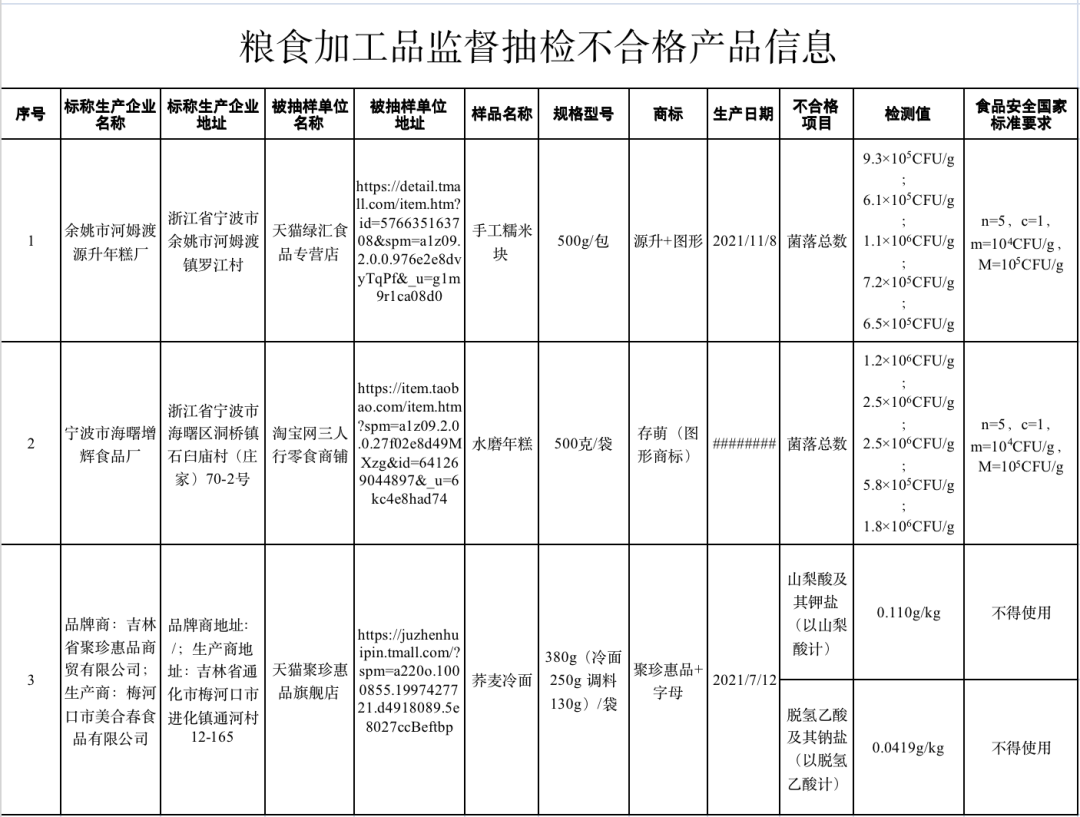 (五)天猫聚珍惠品旗舰店(经营者为吉林省聚珍食品发展有限公司)在天猫商城(网店)销售的、标称品牌商为吉林省聚珍惠品商贸有限公司的、吉林省通化市梅河口市美合春食品有限公司生产的荞麦冷面,其中山梨酸及其钾盐(以山梨酸计)、脱氢乙酸及其钠盐(以脱氢乙酸计)检测值不符合食品安全国家标准规定。