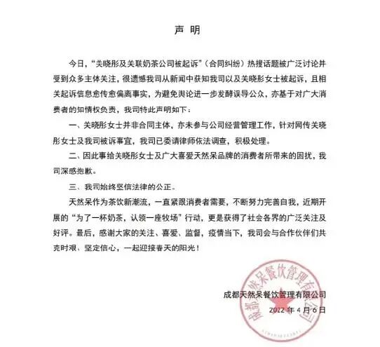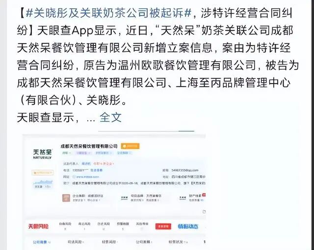据报道,奶茶店和关晓彤在3月底被其他餐饮公司起诉,至于案件进展仍在调查中,明星本人被起诉,这在许多明星特许经营案件中很少发生。