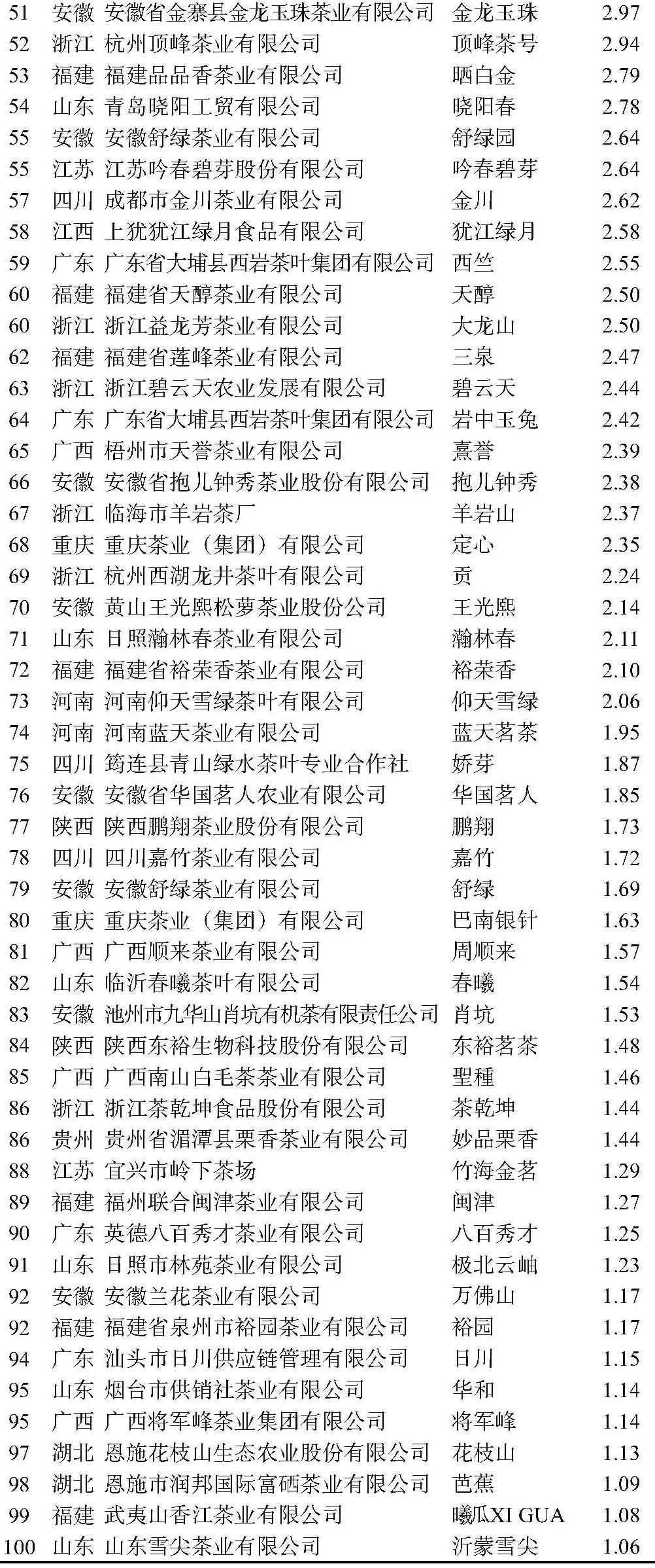 胡晓云, 魏春丽, 李闯, 施金敏, 李姝燕, 吴蕙含. 2021中国茶叶企业产品品牌价值评估报告[J]. 中国茶叶, 2021, 43(6): 21-36.