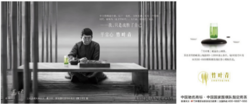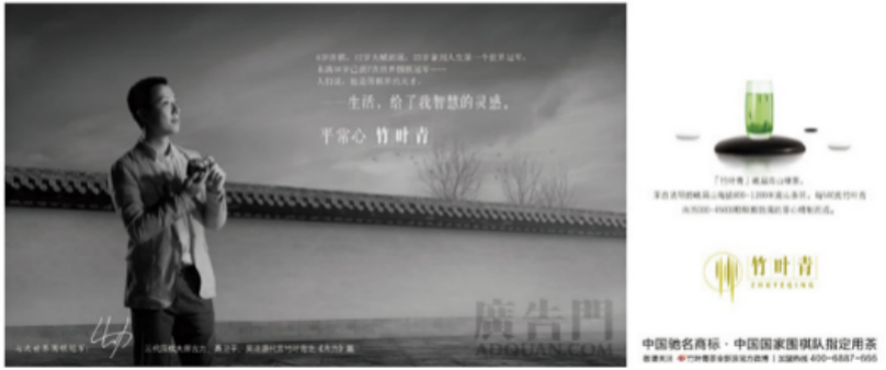 二、竹叶青的品牌代言人策略 竹叶青所倡导的“平常心”是一种“超越平常的人生境界和内心力量”。为了用更具有人性力量的传播策略表现“平常心,竹叶青”的概念,竹叶青试图采用品牌代言者传播策略,而谁能够匹配并提升“平常心,竹叶青”传播概念呢? (一)2003年:链接围棋精神与“平常心”内核 2003年,一则“常昊看重平常心”的报导引发了代理公司选择常昊担任竹叶青品牌代言人的策略动念,并做出以下适用性分析: 1、围棋与“平常心,竹叶青”的匹配性茶和围棋均为中华文明之精髓所在,流传千载,有着深厚的群众基础和人文传统;品茶的意境与下棋的境界十分相似,在气质及精神上十分契合;围棋爱好者众多,在中国就达上亿之众;围棋爱好者与竹叶青品牌的核心消费群体重合度高;且围棋选手不如演艺明星,代言成本低。