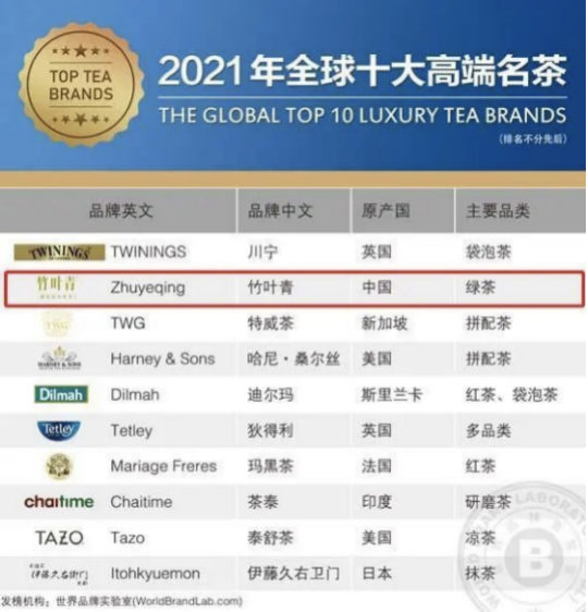 竹叶青连续两年位居茶叶类榜首图片来自中国广告主协会网站 而竹叶青也曾多次作为“民间大使”,向外国友人们传播中国茶文化,如2006年“论道竹叶青”被选为国礼赠送给俄罗斯总统普京;2008年又作为国礼赠俄罗斯总统梅德韦杰夫。中国国际交流中心2019新春会上,竹叶青又被作为国礼茶,礼敬到场与会人员等等。茶界对于竹叶青“国礼茶”的身份已有一定共识,竹叶青也成为了中国茶界的一张“金名片”。 近年来,竹叶青更是凭借坚持不懈的品牌探索与建设,获得了国际的肯定,2021年,竹叶青荣登《全球十大高端名茶榜》,为唯一入选此榜的中国茶品牌,同在榜内的有英国百年品牌川宁和新加坡品牌百年品牌TWG茶等。竹叶青能够入选此榜,清晰地表明其达到了高品质茶的水平,更是已经得到了国际茶界的认可。