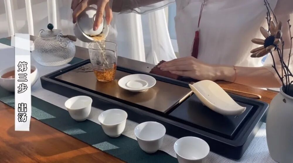 盖上盖碗盖子,持盖碗向前呈弧度前倾,将茶汤倒入公道杯、茶杯中饮用。