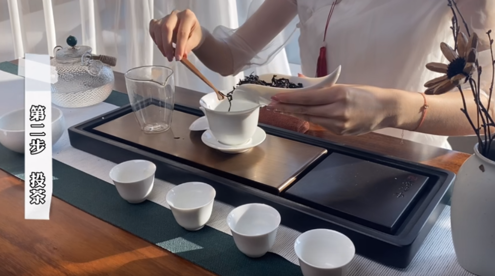 注意,投茶之时,尽量使用茶具,而不要直接徒手投茶。