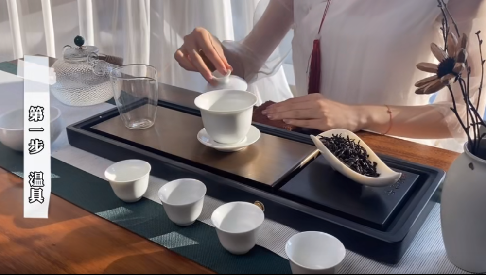 之后将开水倒入盖碗、公道杯等茶具之中,均匀烫洗一遍,一则去除茶具异味,二则可以激发茶香。