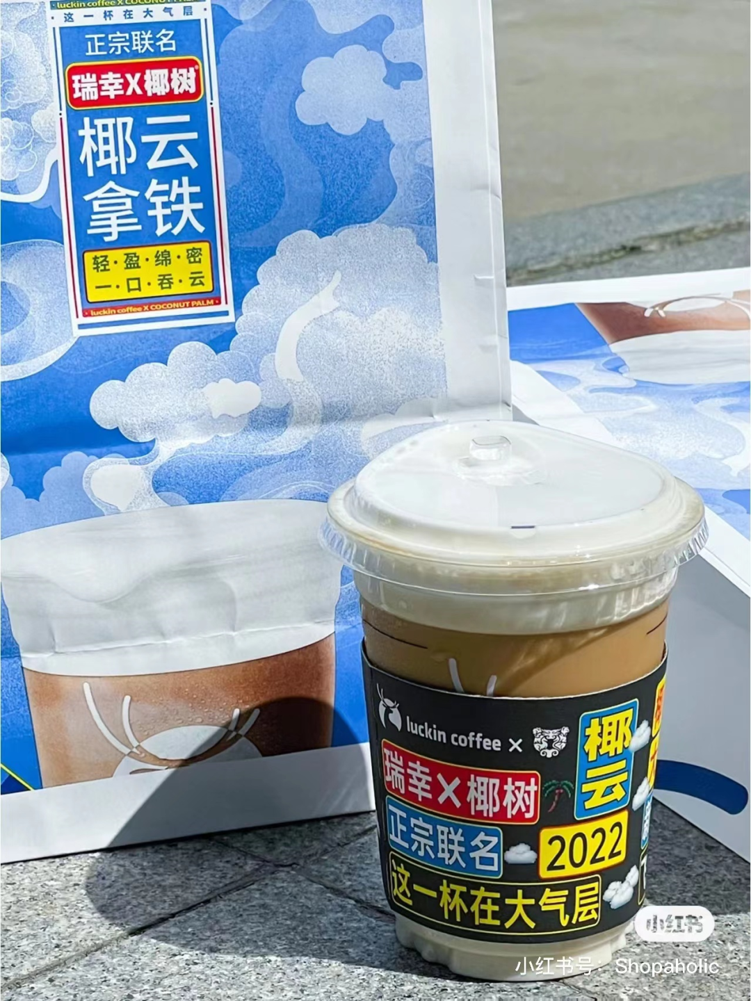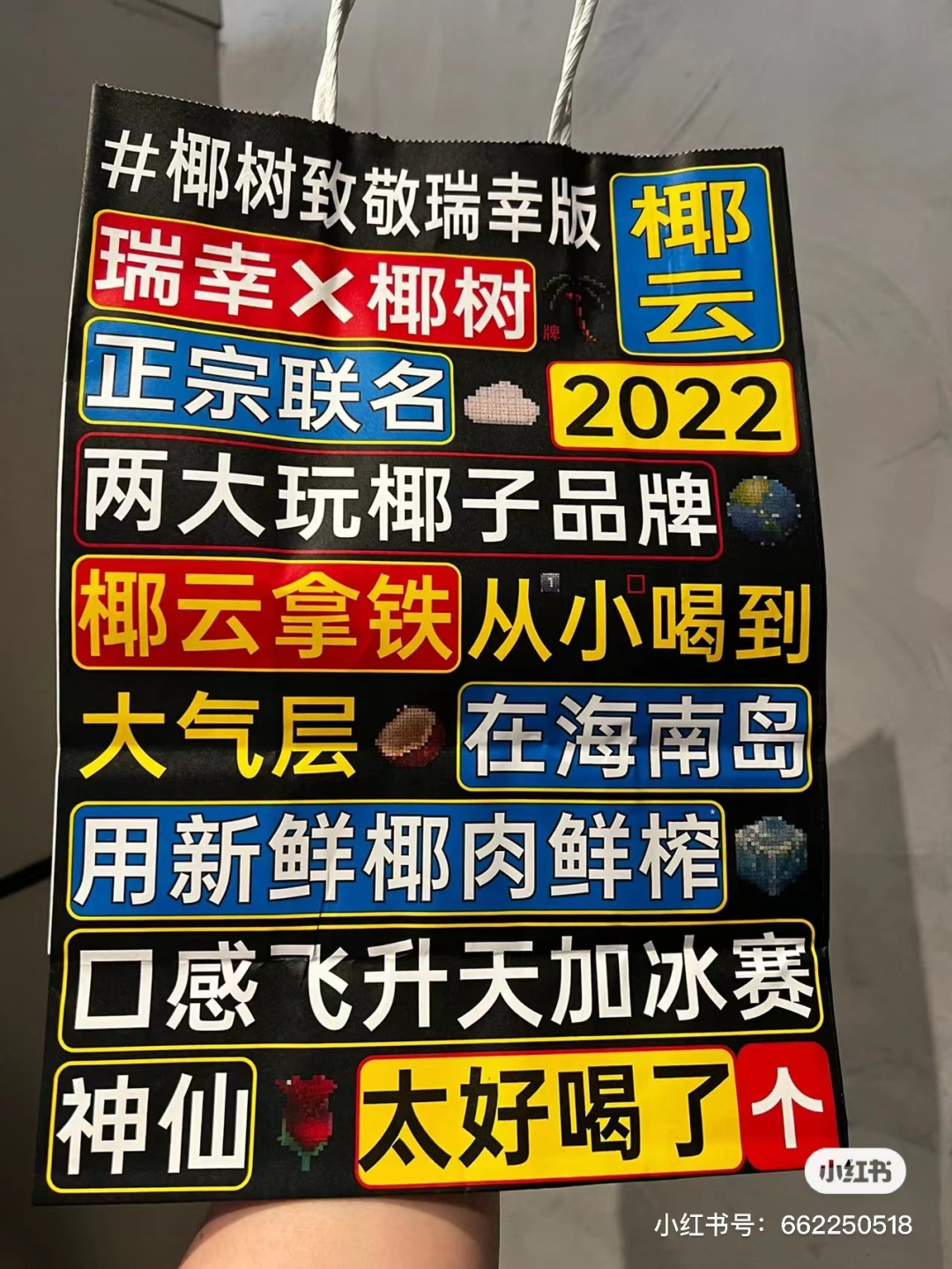 为了配合和椰树椰汁的联名,甚至是购物袋设计,瑞幸也做了一版椰树椰汁款,拿着走在街上,一定倍有回头率: