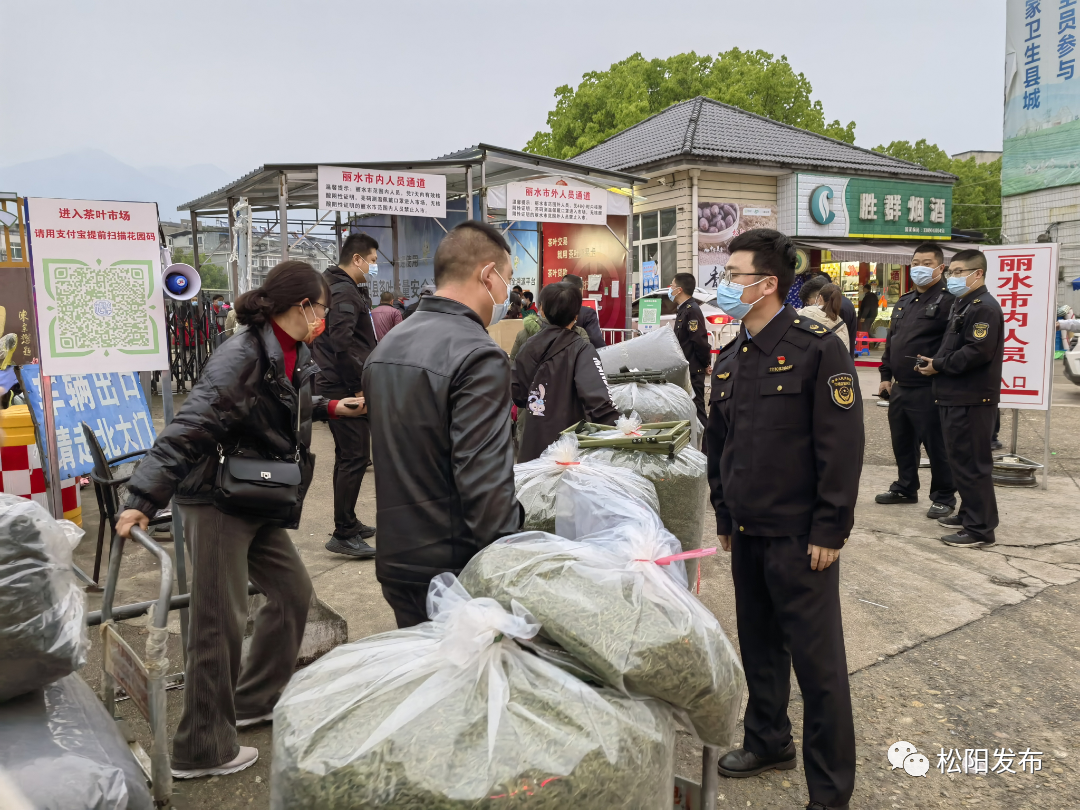 6:00 开 市 核 验每日此时,市场大门会准时开放,大批茶农、茶商在入场等候区排着队等候进场。“你好,请打开支付宝扫描丽水花园码,并出示有效核酸检测证明!”入场人员手中的“丽水花园码”能够显示新冠疫苗接种情况及核酸检测信息,市外来松人员需持48小时内的核酸证明,市内来松人员需持7天内的核酸证明。符合入场要求的人员在工作人员的引导和核验下,有序从各个入口依次进入市场。