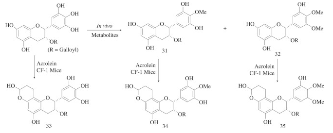 茶多酚的捕获目标不仅限于GO和MGO等RCS。一般来说,参与亲核反应的强烈倾向是富含电子的多酚的本质。除了GO和MGO之外,茶多酚及其代谢产物还可以清除与人类健康有关的其他电子缺陷剂。最近,EGCG及其体内代谢产物在体外和体内都能捕获丙烯醛。如MS/MS所示,EGCG对丙烯醛的体内捕获导致与另一个吡喃环形成加合物,该吡喃环与A环苯(33)(图5)融合,同时需要NMR确认。有趣的是,EGCG的甲基化代谢产物(31,32)(图5)也通过同样的途径清除小鼠体内的内源性丙烯醛,产生甲基化EGCG的苯并吡喃加合物(34,35)(图5)。因此,摄入EGCG可以通过直接捕获或通过其甲基化代谢产物清除内源性丙烯醛。图5 EGCG及其体内代谢产物捕获丙烯醛