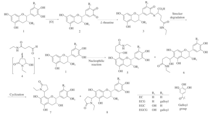 如图1所示,有4 种主要的茶儿茶素,即(−)-表儿茶素(EC),(−)-表没食子儿茶素(EGC),(−)-表儿茶素没食子酸酯(ECG)和EGCG。除了完全发酵的普洱茶和后发酵的黑茶外,在大多数种类的茶中,EGCG是最丰富的儿茶素,其次是ECG、EGC和EC。L-茶氨酸也称为N5-乙基-L-谷氨酰胺,被认为是一种非蛋白质氨基酸和茶叶的特征成分,约占茶叶中游离氨基酸总量的一半。L-茶氨酸类似于谷氨酸的结构,谷氨酸是一种重要的神经递质,可以穿过血脑屏障,在中枢神经系统中发挥重要作用,如压力管理、焦虑缓解和抗抑郁。在茶叶加工过程中,观察到L-茶氨酸的含量仅在枯萎阶段就持续下降一半以上,而咖啡因和其他氨基酸的含量则在增加。如图2所示,可以假设详细的机理始于儿茶素(1)氧化生成1,2-二羰基醌(2),然后被L-茶氨酸的α-氨基攻击,在儿茶素醌和L-茶氨酸之间形成亚氨基连接的复合物(3)。生成的复合物经过Strecker降解生成L-茶氨酸衍生的醛,该醛在游离醛和环化N-乙基-5-羟基-2-吡咯烷酮(4)之间处于平衡状态。随后,L-茶氨酸衍生的醛和儿茶素在儿茶素的6-和8-位置进行亲核加成,产生6-和8-取代儿茶素(5和6),其将经历分子内脱水以形成6-和8-N-乙基-2-吡咯烷酮-黄酮(7和8)。图2 绿茶采后形成黄生物碱的机理