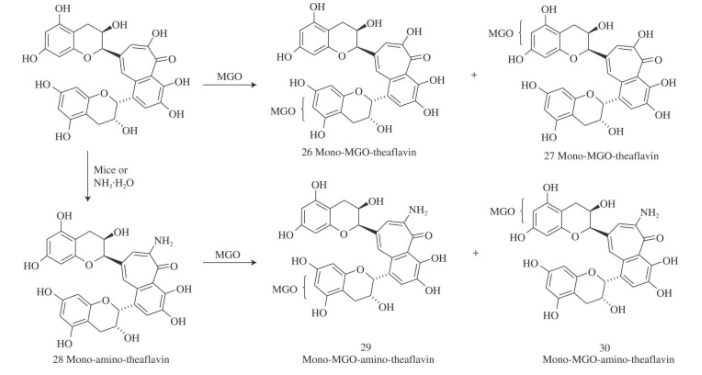 红茶中的茶黄素也被发现具有捕镁活性,但直到去年才提出加合物结构。根据MS/MS分析,发现了3 种单MGO取代的茶黄素。添加位置分配给茶黄素部分(26,27)的A环(图4),但MGO和两个A环的C-6或C-8位置之一之间的精确联系尚未确定。这需要通过NMR分析进一步分离和表征茶黄素的MGO糖基化加合物,以确定这些加合物的结构。通过MS/MS和NMR分析,CD-1小鼠红茶茶黄素的代谢物被鉴定为单胺化茶黄素(28)(图4),其中茶黄素部分B环(苯并酮核心)上的8′-OH被氨基取代。单胺化茶黄素的氧化镁清除活性与茶黄素相似。4 种MGO加合物(29,30)是基于MS/MS鉴定的,但这些结构仍有待于NMR分析确认。图4 茶黄素和氧化镁的结构,氨基茶黄素和茶黄素与氧化镁的加合物