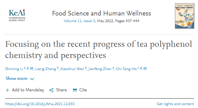 LI S M, ZHANG L, WAN X C, et al. Focusing on the recent progress of tea polyphenol chemistry and perspectives[J]. Food Science and Human Wellness, 2022, 11(3): 437-444. DOI:10.1016/j.fshw.2021.12.033.