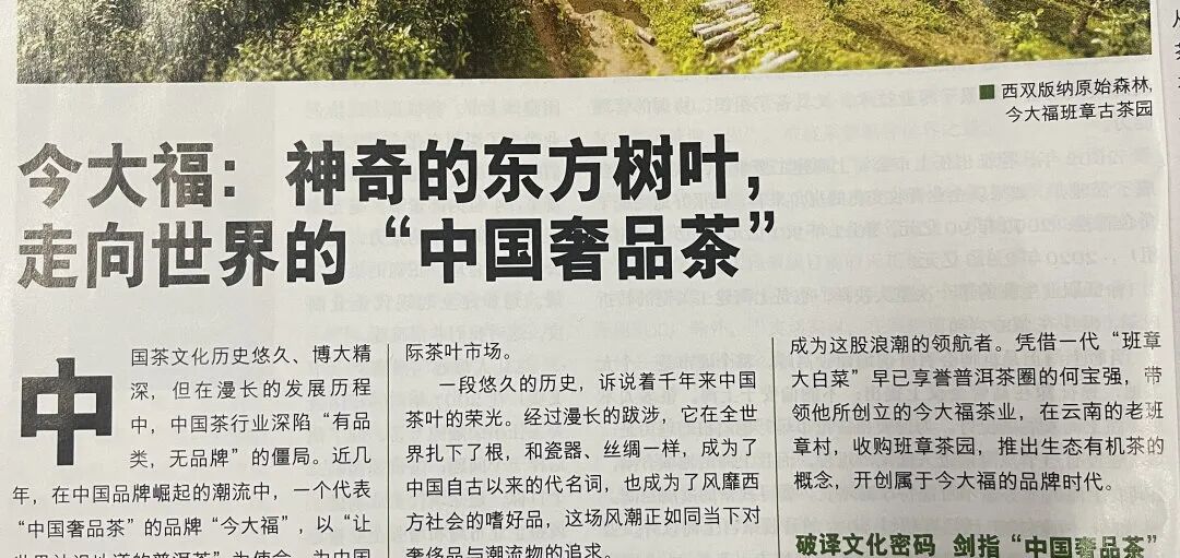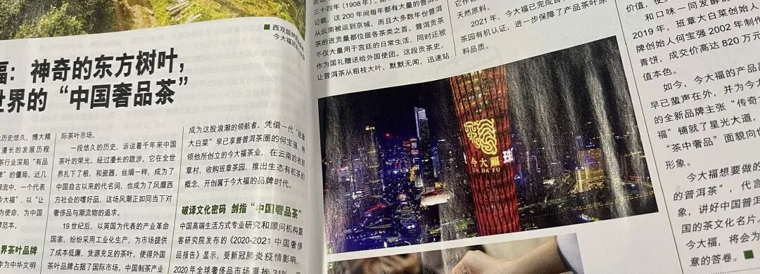 近期,《财富》(中文版3/4月刊)刊登了一篇今大福专题文章,题目叫《神奇的东方树叶,走向世界的中国奢品茶》,深度解读了今大福如何在工艺、生态、收藏等价值方面,传承中国普洱茶文化、打造中国茶品牌范本。