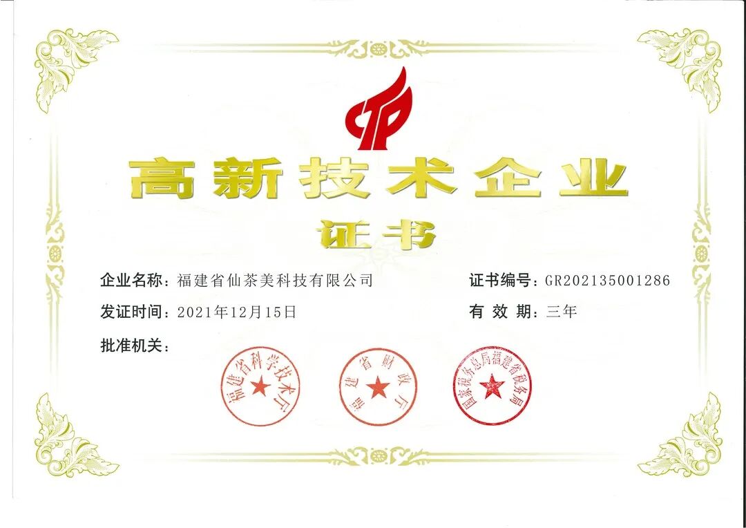 喜讯!热烈祝贺福建省仙茶美科技有限公司荣获“高新技术企业证书”