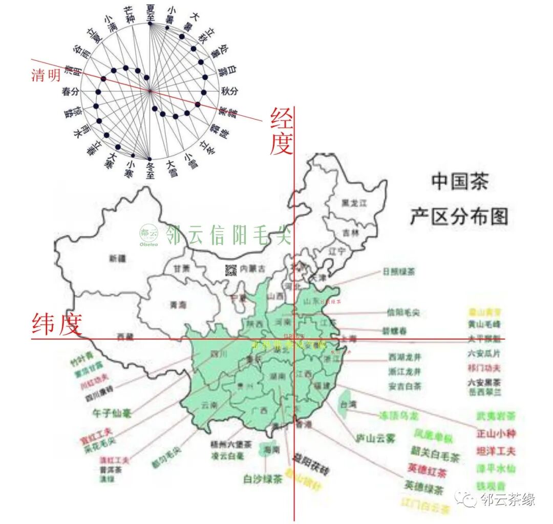①纬度,信阳地处秦岭淮河以南,四季分明,是河南省唯一的一个地处亚热带季风气候的区域,雨水量、湿度、温度完全能满足茶树的生长需要,这就像《易经•乾卦•彖辞》:“......,云行雨施、物品流形。”,茶树也是大自然的孩子,所处的地理位置决定了它的性格,植物不像动物可以迁居,它的气候特征更为明显。信阳的雨水量、温度、湿度又不像江南、沿海地带那么‘过’,这样导致了信阳毛尖茶在上一年秋末(停止生长)到第二年的清明前开始发芽,这一段时间周期会比较南方的茶树长(高海拔的茶会更长),意思就是‘孕育’的时间更长,茶的味道会更加丰富。