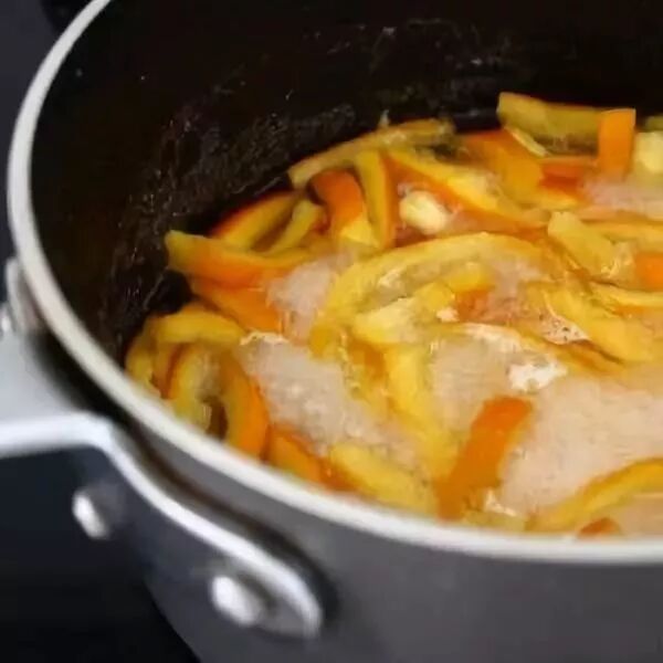 锅内放水,水量盖过橘子皮,煮沸后换小火继续加热15分钟,让橘皮内部的精油释放出来。
