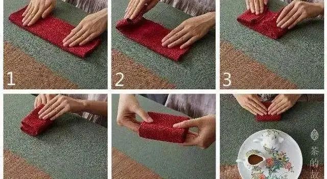 [使用]使用茶巾时,应将拇指放在上面,其余四指在下托起茶巾。用左手拿茶巾,右手持茶具,再用茶巾擦拭茶渍、水渍等。