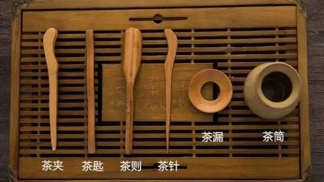 茶道具主要有六件,分别是茶筒、茶匙、茶漏、茶针、茶则、茶夹,称为“茶艺六君子”。