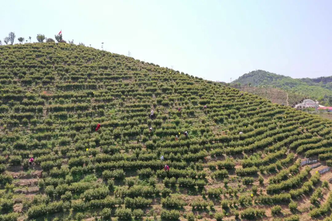 距离韩冲村25公里的双椿铺镇顾畈村信阳黄金茶园,500多采茶工零星分布在1300余亩的茶园里,很是壮观。