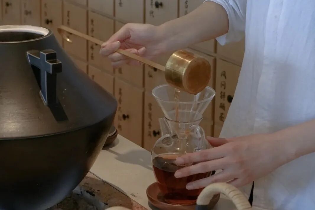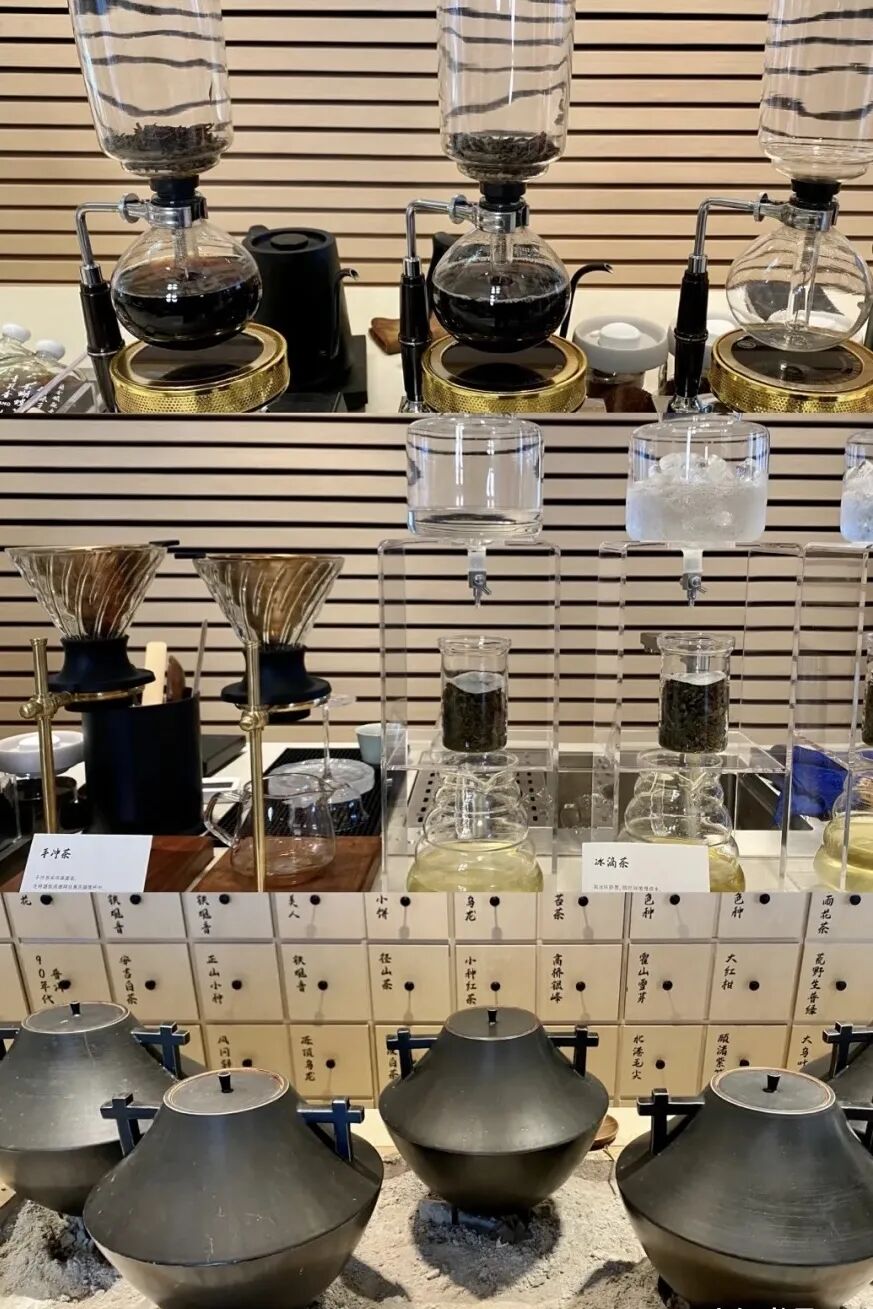 使用了咖啡的萃取方式来制茶,左转进来看到长吧台是传统冲泡区,热泡、炭煮,还有特色茶啤。