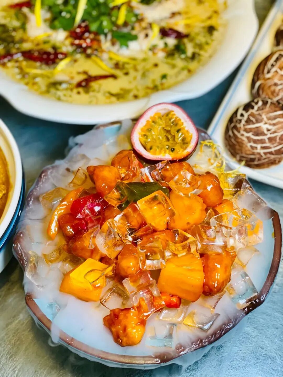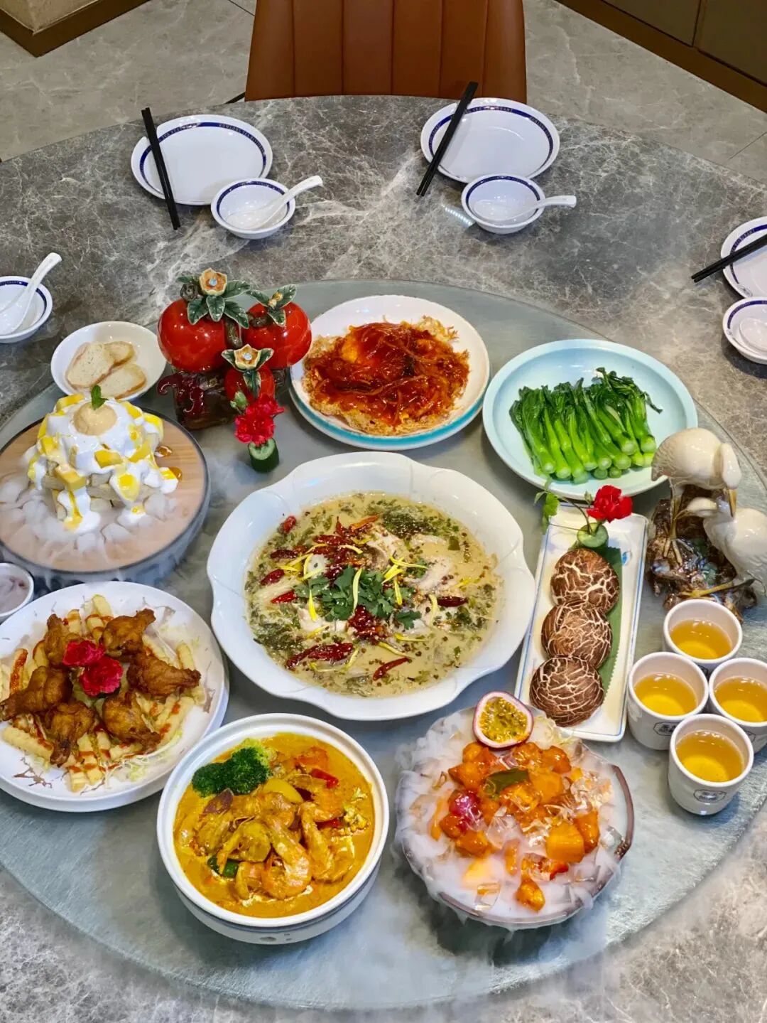 · 马来咖喱虾香茅鸡翅根6只招牌九龙酸菜鱼冰镇咕噜肉五柳炸蛋芒果雪山白灼时蔬蘑菇包餐位4
