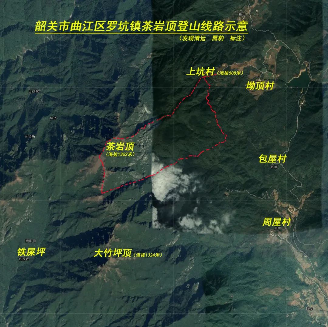 茶岩顶位于韶关曲江和清远英德交界处。绝大多数人选择的登山起点是曲江区罗坑镇上坑村。登顶后原路返回不用5小时即可完成;如果走一日小环线,15公里累计爬升约1100米,耗时则需要8小时。