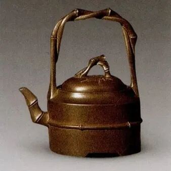 茶壶整体造型仿自竹节,椭圆形壶身,围饰弦纹一圈,矮圈足,壶嘴塑成三节竹节曲流,壶把则为两枝细长竹枝缠扭成形。盖为椭圆拱形,上贴饰竹叶两丛,盖纽亦为双竹枝相扭成拱桥式,盖顶正中一小通气圆孔。紫砂泥质地较细,颗粒微粗,含黑、黄砂点。 壶底印铃「陈荫年制」篆刻方印。