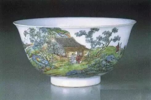 碗内白地无纹,外壁一面画山水人物,背山面水,竹林小屋,一士人坐于屋内,一僮旁侍,屋外桥边二人驻足交谈,一人指向屋内,远山苍润,小桥流水,皴石茂林,烘托出一幅清朗宜人的山水人物图景。 碗壁另一面墨书「连村多绿树,长日转黄鹂。」前后红彩书「竹石」、「山高」、「水长」三印。胎质细腻,胎薄透光。底蓝料书「乾隆年制」四字二行仿宋体楷款,外加双方框。此碗釉彩设色以青绿为主、黄蓝为点缀,是一幅精美的山水人物图画,为宫廷画匠所绘。