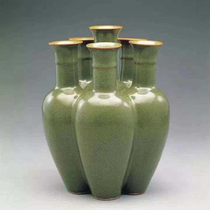 此品造形奇特,由五只相同尺寸、形制的瓶子环绕着中央的主瓶。最难得的是,周边的五个瓶子,大小近乎相等。黏贴的过程是对准了主瓶的穿孔,由此可见,乾隆官窑悉心照顾细节的特色。