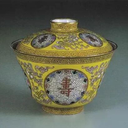 碗内白地上满画粉彩梅花、蝴蝶,器、盖内外口沿及底边、圈足均画回纹一道,碗、盖外壁黄地上四圆形开光万字内各书「万」「寿」「无」「疆」,并围以如意云纹;开光间以蝙蝠、桃实、盘长等纹饰,寓意万寿无疆。盖圈足内及碗底朱红「长春同庆」四字二行楷款。