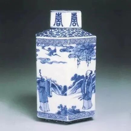 纹识描述:盖面青花绘一蟠螭,盖壁饰六字三种不同书法的「寿」字,加饰青线三道,罐肩满画如意纹,罐腹则饰山水人物画,云松下二老者,一抬头持杖遥指飞翔而来的仙鹤,另一老者及一背罐童子亦仰面迎望飞鹤,罐腹上下各饰回纹一周,足边则为转枝叶纹一周。 底青花书「大清康熙年制」六字二行楷款。同类造型亦有锡制茶叶罐。