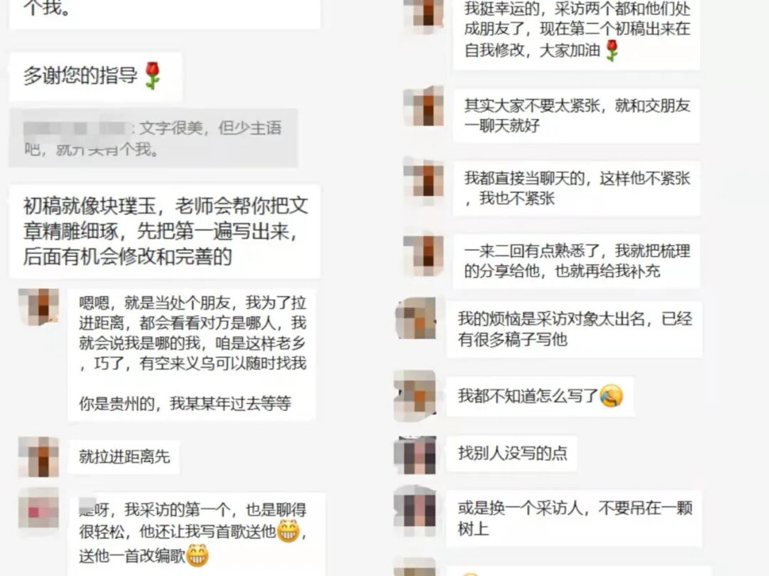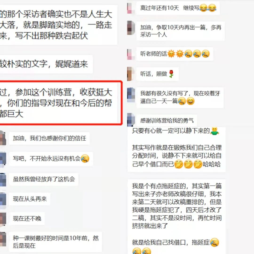 (学员谈采访感受,有氛围后行动变得更容易)很多人有文字基础,却没有采访基础,每邀请一个新作者加入都要从头到尾讲一遍如何采访、如何写采访稿,费时又费力,不如创建培训班,请专业的老师指导把我们的学员培养成我们需要的作者。我们的培训目标很明确,产出自己的签约作者,这些作者大部分从零开始学写采访稿,现在已经能独立成文,每月为我们固定供稿。