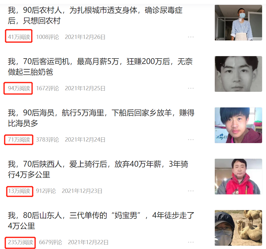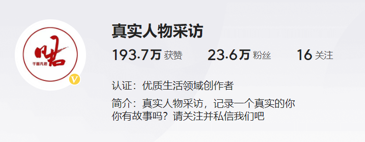 【真实人物采访】于2021年8月底诞生,是一个全网发文的账号,采访了近300人并记录他们的真实故事,虽然只有半年,但我们单平台最高粉丝已经超20万。