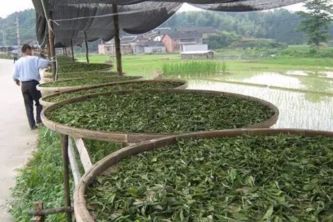 晒茶即是将茶叶均匀的摊开,让阳光将茶尖内的水分蒸发至,当叶片变得柔软,茶叶中的涩味变得较淡时即可移到室内。