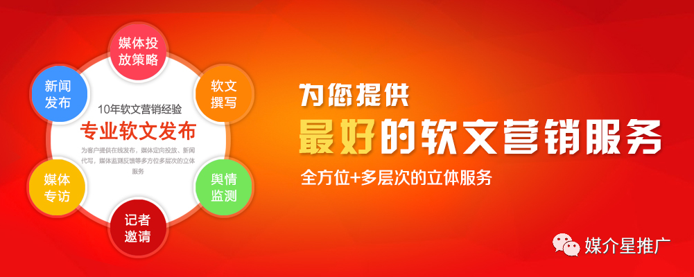 媒介星软文发稿平台专注新闻软文发稿,软文代写,软文营销等服务,一手网络新闻媒体推广平台,多维度提供广告主和媒体编辑直线对接,为企业提供网站推广 网站排名 数据优化,口碑推广营销,品牌策划,软文代写、新闻源发布、软文发稿等服务为主。联系:189-7948-0970(同号)
