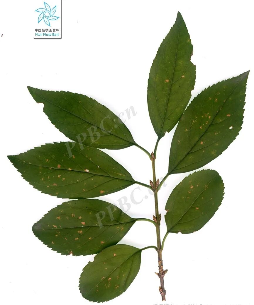 叶通常为单叶,或3裂至三出复叶,叶片卵形、宽卵形或椭圆状卵形至椭圆形,长2-10厘米,宽1.5-5厘米,先端锐尖,基部圆形、宽楔形至楔形,叶缘除基部外具锐锯齿或粗锯齿,上面深绿色,下面淡黄绿色,两面无毛;叶柄长0.8-1.5厘米,无毛。