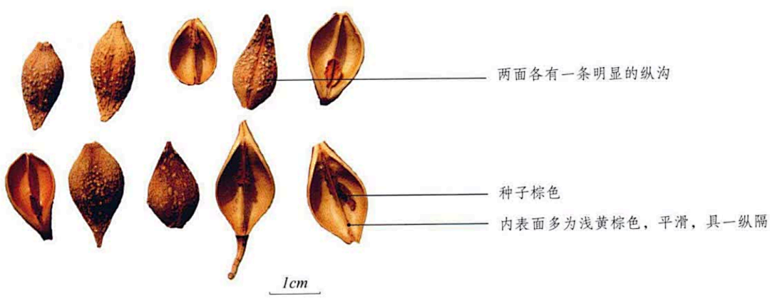 本品长卵形至卵形,稍扁。长1.5~2.5 cm,直径0.5~1.3 cm。表面有不规则的纵皱纹及多数凸起的小斑点,两面各有1条明显的纵沟。顶端锐尖,基部有小果柄或已脱落。